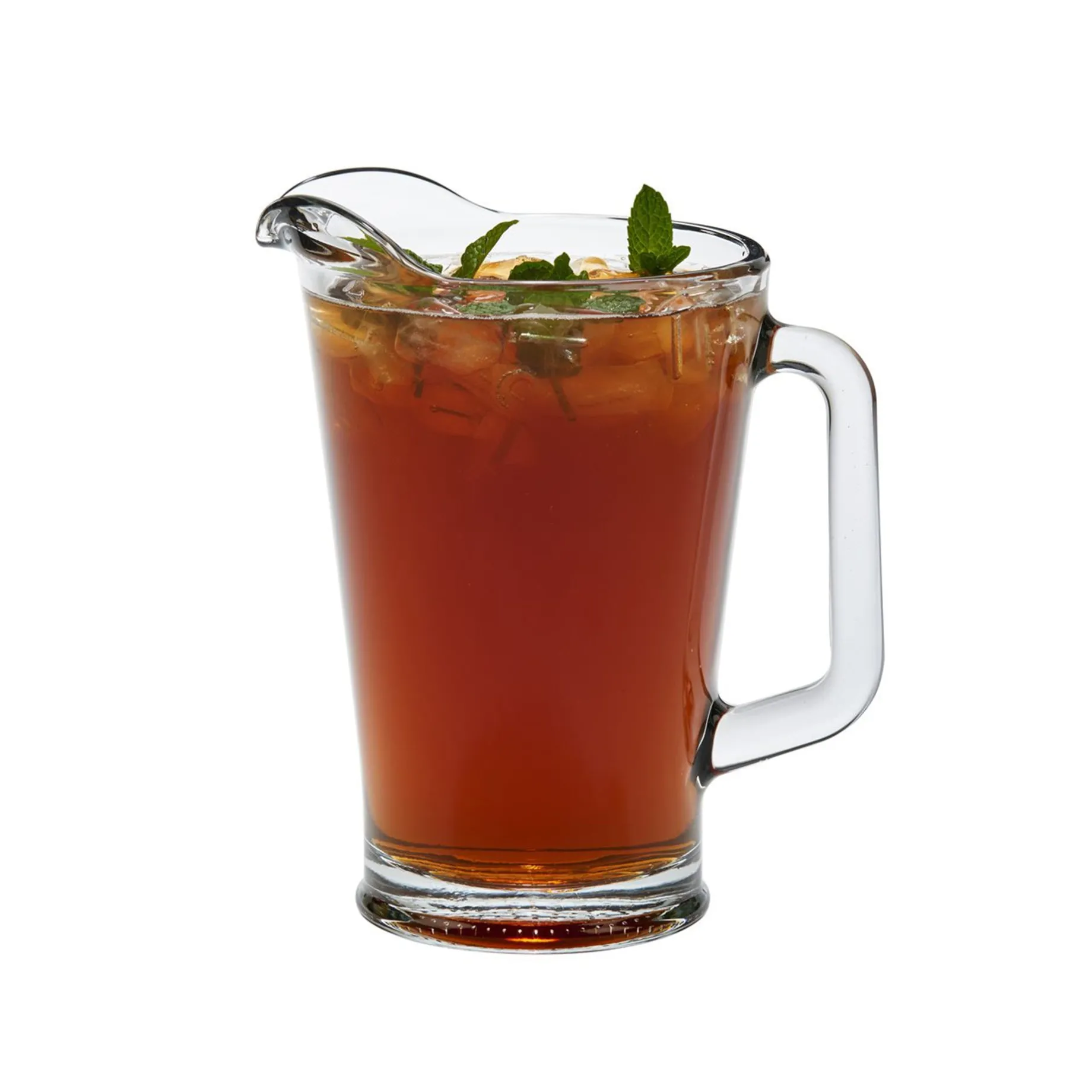 This 9″ tall glass beverage pitcher is truly all-purpose. The base is 4.5″ that flairs to 5.5″ diameter at the top (not including the handle and spout). This is a heavy duty pitcher that you can use in a dining room or a home wet bar or even in commercial applications. We carefully pack 6 of these pitchers in a brown corrugated box.