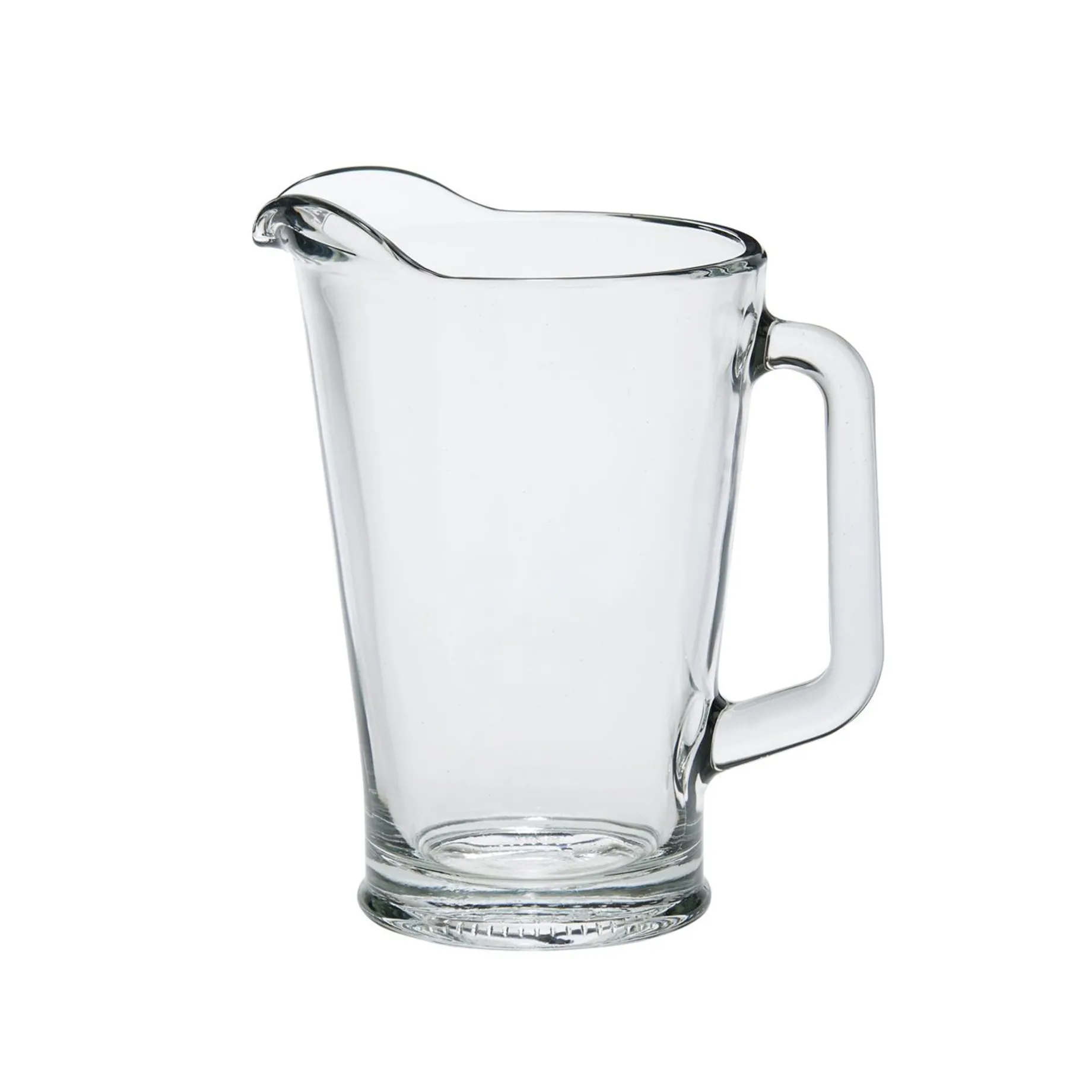 This 9″ tall glass beverage pitcher is truly all-purpose. The base is 4.5″ that flairs to 5.5″ diameter at the top (not including the handle and spout). This is a heavy duty pitcher that you can use in a dining room or a home wet bar or even in commercial applications. We carefully pack 6 of these pitchers in a brown corrugated box.