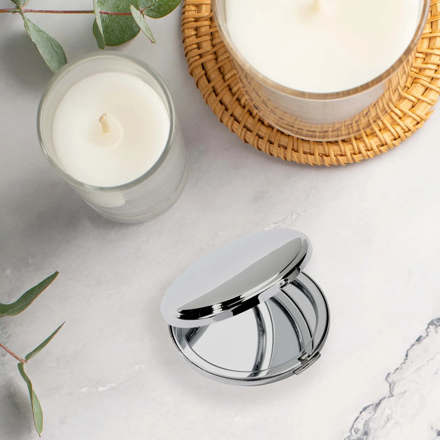 This 2.25″ round hinged mirror compact is simple and elegant. Suitable for engraving (available but not included) it features 2 mirrors inside – one magnifying – it is a non-tarnishing nickel plated finish. Gift Boxed.