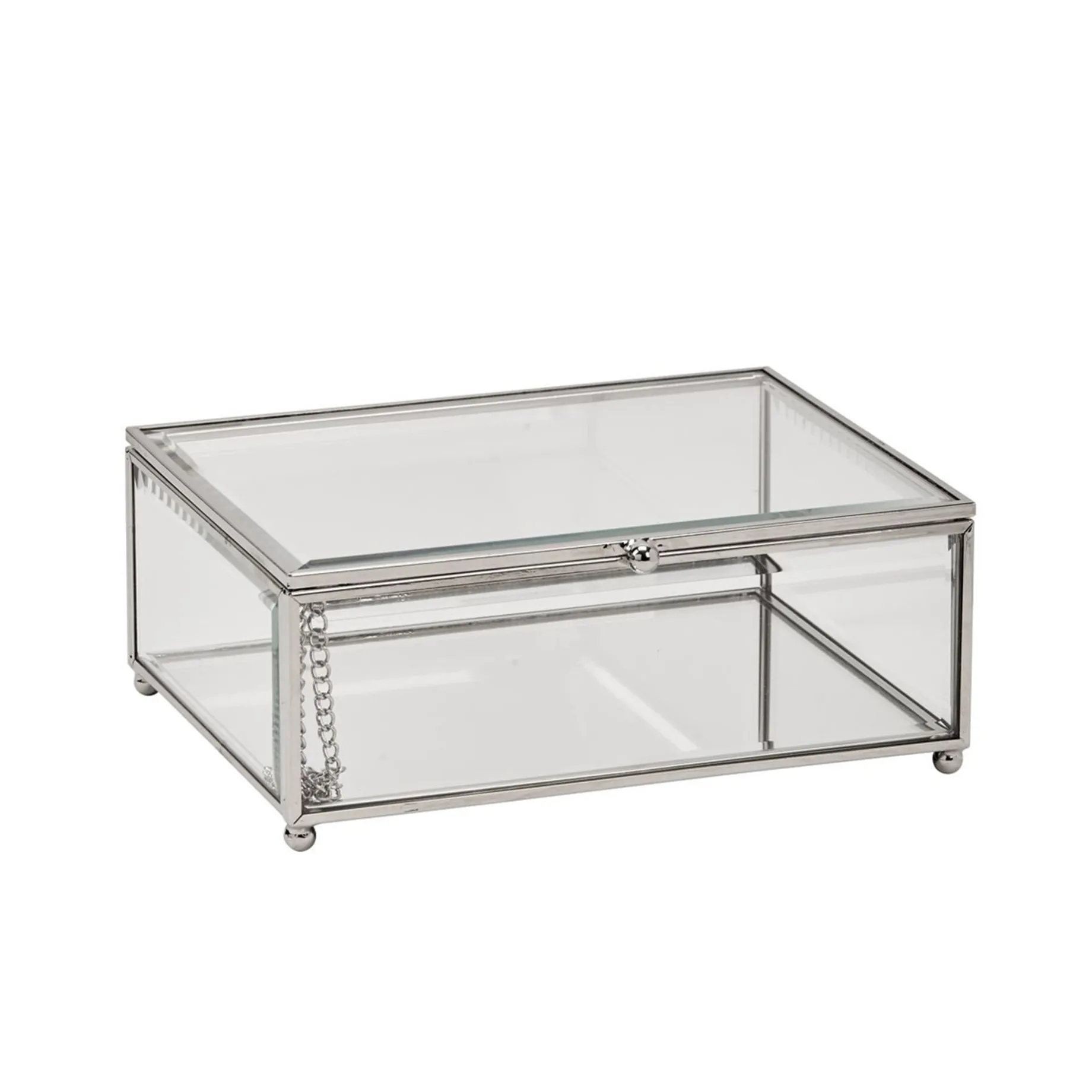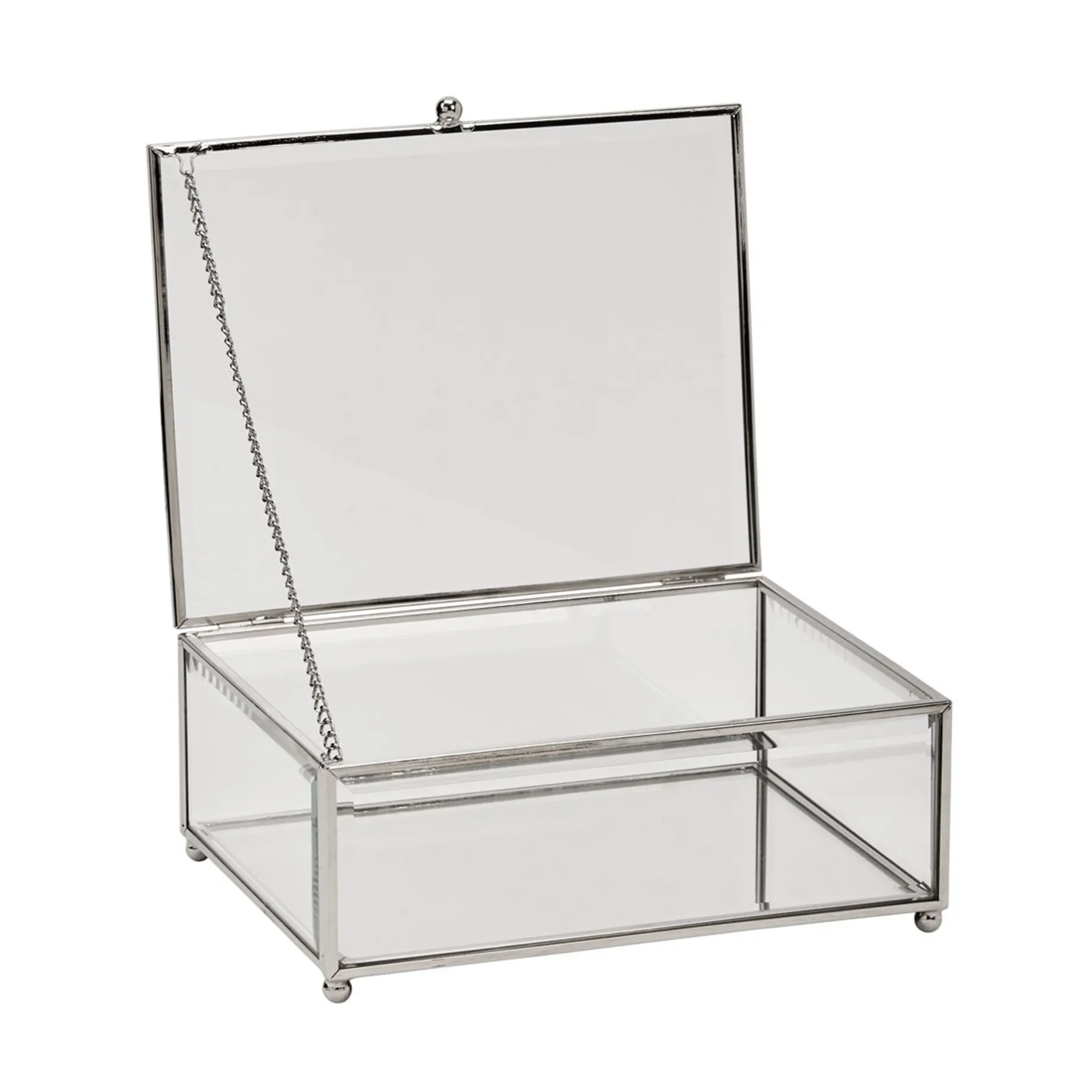 This Claro Hinged Glass Box is 7.25″ x 5.5″ x 2.75″. It’s a great jewelry box because you can see the contents so easily. It’s also great for all kinds of storage and even presentations of collections and collectibles for the same reason. Claro Hinged Glass Boxes are available in 2 sizes. All feature metal frames, ball feet, beveled glass, mirror bottoms and hinged lids with safety chains to prevent them from over-opening.