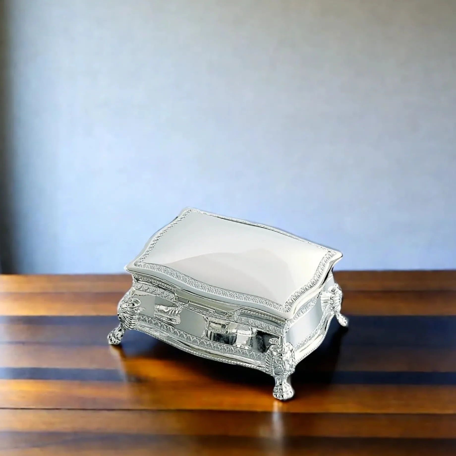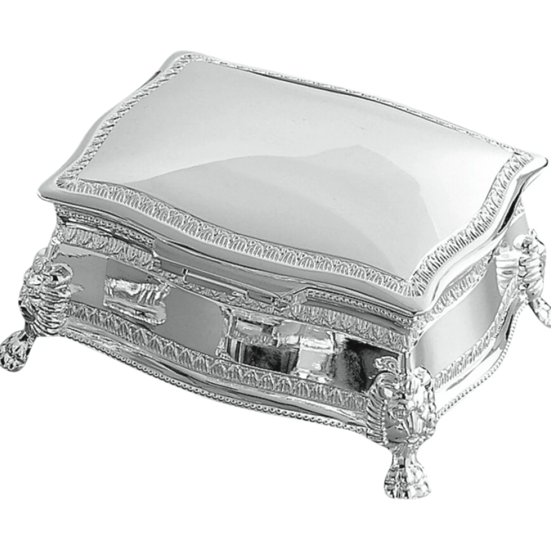 This elegant 6″ x 5″ “Figaro” box is plated with nickel to give the box a shiny silver look that will not tarnish. The cover is hinged and has a scroll design imbedded inside the cover. The bottom of the box is lined with a dark blue flocked cloth lining. The cover can be engraved with a monogram to personalize this gift. The box has 4 feet with a lion head design at the top of each of the 4 feet. White gift box.