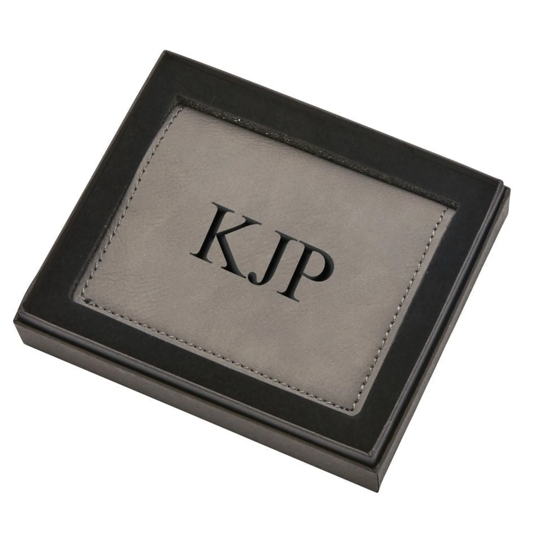 Our grey leatherette wallet is perfect for carrying your cash, credit cards and ID. The wallet measures 4″ x 3.25″ when folded and 4″ x 6.5″ when open. The wallet has 6 slots for credit cards or various forms of ID. The item can be laser engraved and the engraving shows as black. Gift Boxed.