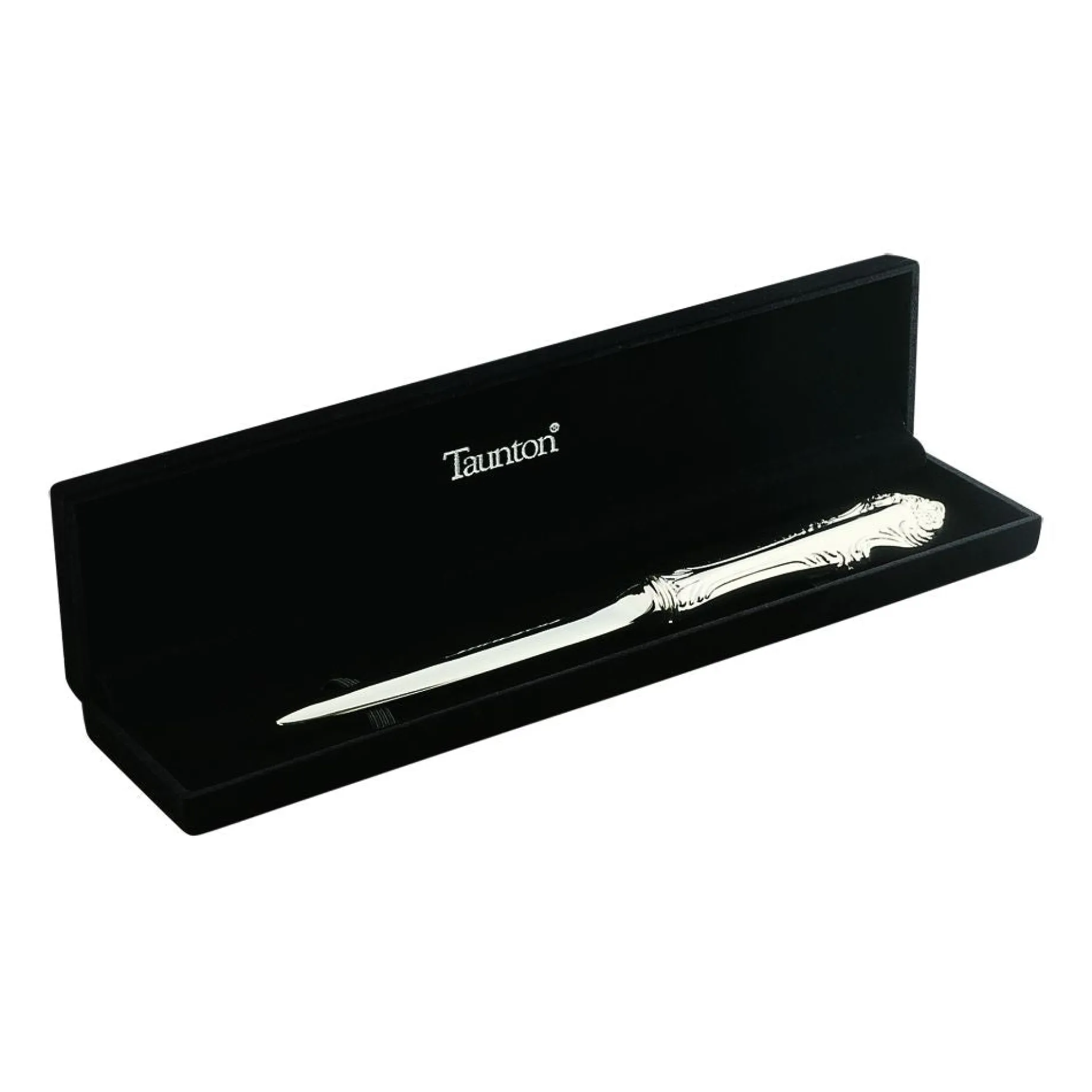 This ornate design “Kings” pattern handle is a traditional design that dates back to the 19th century. This pattern was originally used for flatware. This bright silver 8″ letter opener is nickel plated and will not tarnish. Packed in black velveteen gift box.