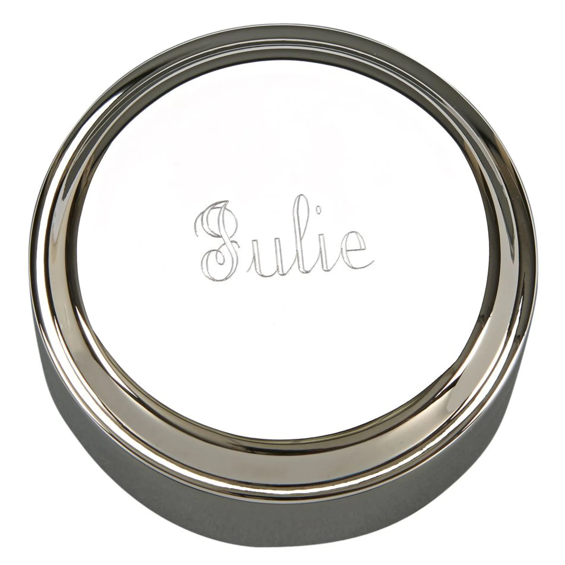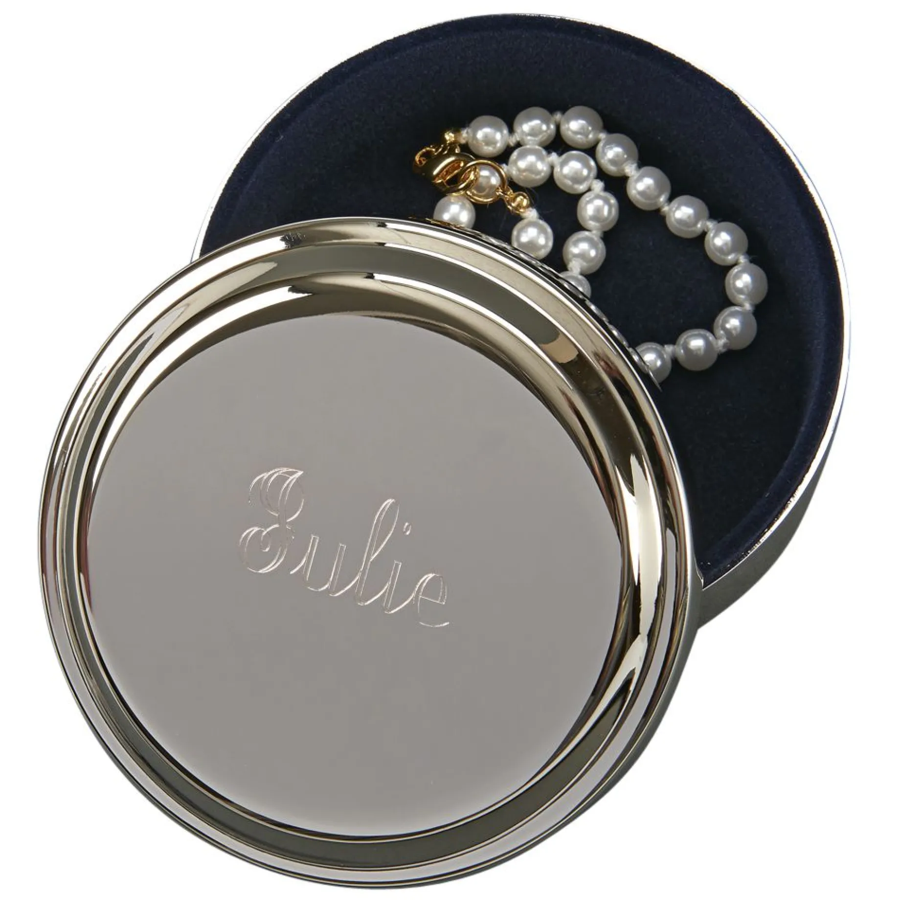 This classic 3.5″ round shaped box is plated with nickel to give the box a shiny silver look that will not tarnish. The cover lifts off and the inside cover of the box is lined with a dark blue flocked cloth. The cover allows room to engrave a special message or a monogram. White gift box.